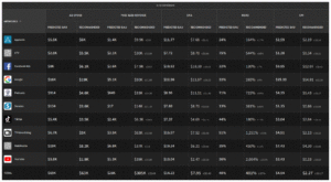 The Recommendations Table displays network metrics split by Predicted BAU and AIM Recommended metric value. This table provides a detailed view of AIM’s recommendations for the period you select (day, week, or month) in the Spend Line Chart above.